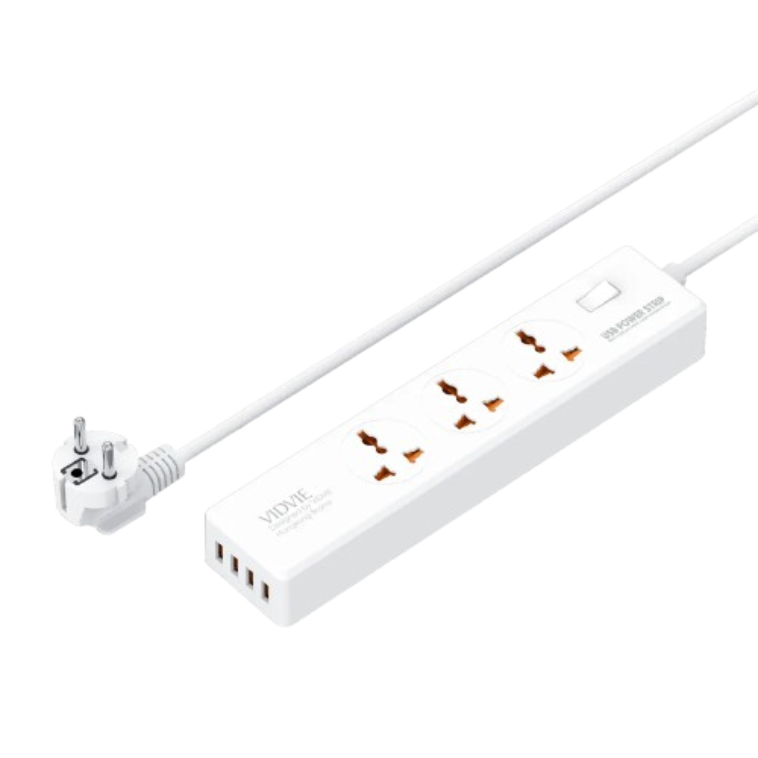 Regleta eléctrica VIDVIE PSE01 con tomas de corriente y 4 puertos USB, diseñada para uso doméstico y de oficina para alimentar equipos y cargar dispositivos móviles simultáneamente.